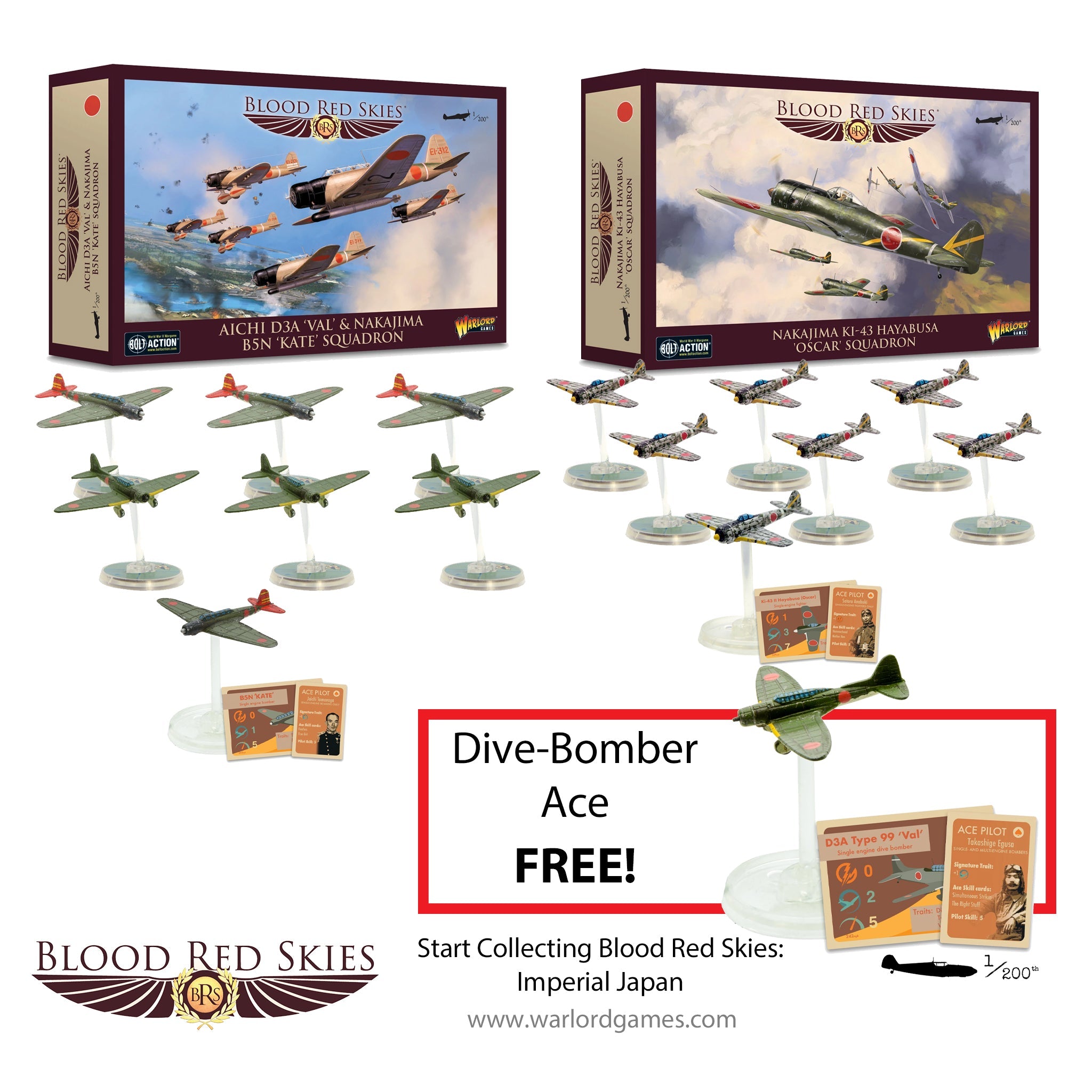 Got a hold of the Battle of Midway Blood Red Skies Starter Set and set on expanding your roster of aircraft? This bundle brings you three additional types of aircraft (a total of fifteen aircraft) ideal to expand your Imperial Japanese air forces. Included are torpedo and dive bombers, essential for scenario play, as well as three Ace pilots (one of which is completely free) with which you’ll discover exciting new aerial tactics.