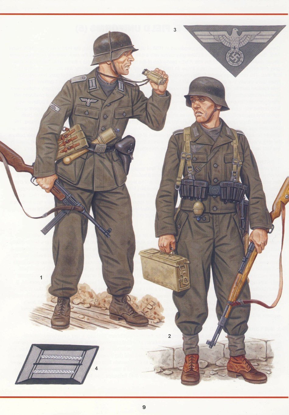 The book is written by a noted authority on the subject and is lavishly illustrated throughout with 15 full colour artwork plates specially painted by the author, Stephen Andrew. The superb colour artwork plates show combat figures in their various service uniforms; field grey models, summer, tropical, winter, camouflage uniforms, their personal equipment and uniform insignia which is all in unrivalled detail; with accompanying in depth text of when items were first issued and seen in the frontline. Also included are the important variations of manufacture and the colour information.